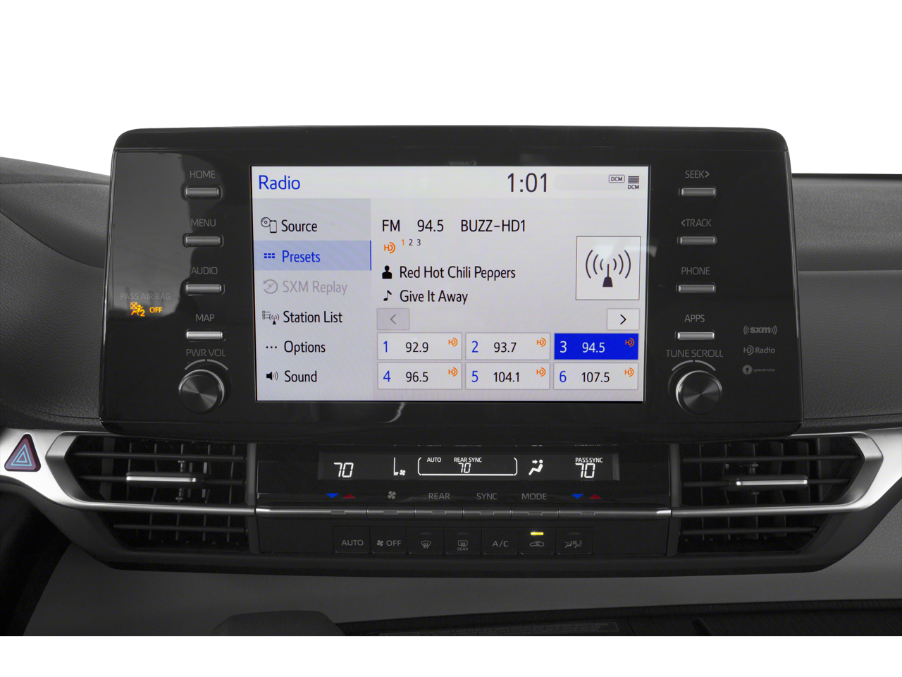 - Radio: Audio -inc: 6 speakers, 9" touchscreen, Android Auto, Apple CarPlay, Amazon Alexa compatibility, USB media port, 6 USB charge ports, hands-free phone capability and music streaming via Bluetooth wireless technology, SiriusXM w/3-month All Access trial, Safety Connect w/1-year trial, Wi-Fi Connect w/up to 2 GB within 3-month trial and Service Connect w/10-year trial See toyota.com/audio-multimedia for details. See toyota.com/connect-services for details.